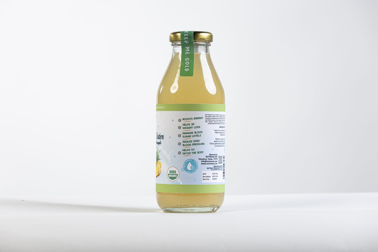 “Experience a tropical escape with our pineapple-infused coconut water, a sip of paradise that combines the refreshing sweetness of pineapple with the natural hydration of coconut, taking you on a journey to beachfront bliss!”